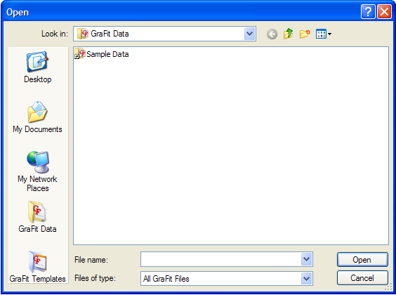 GraFit 6 offers integrated selection of GraFit-specific file locations, including "My GraFit Data" and "My GraFit Templates" directories. On Microsoft Windows Vista, GraFit also uses the enhanced Vista-specific file dialogs that have common "Favorite Links" and built-in file searching.